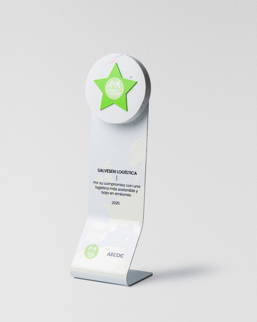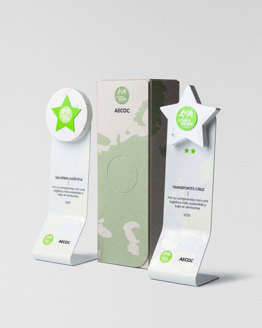 Os Prémios AECOC Lean & Green 2025 reconhecem os marcos alcançados pelas empresas na redução progressiva das emissões logísticas. O troféu, produzido em peças de polietileno reciclado e acabado com gravação a laser, apresenta uma geometria modular que simboliza avanço contínuo e medição rigorosa do programa.